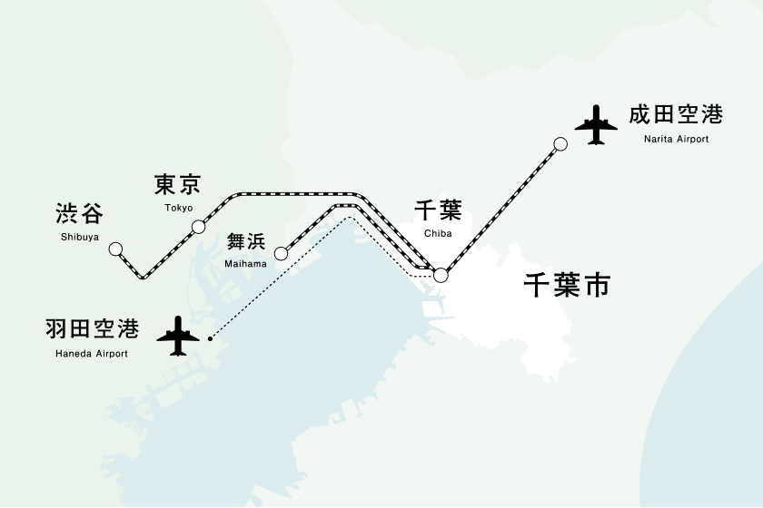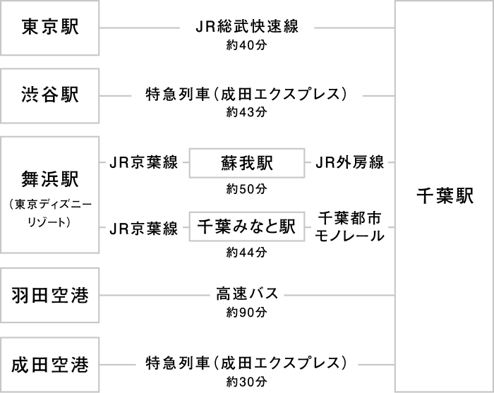 特急列車(成田エクスプレス)で約30分 (成田空港駅~千葉駅) |