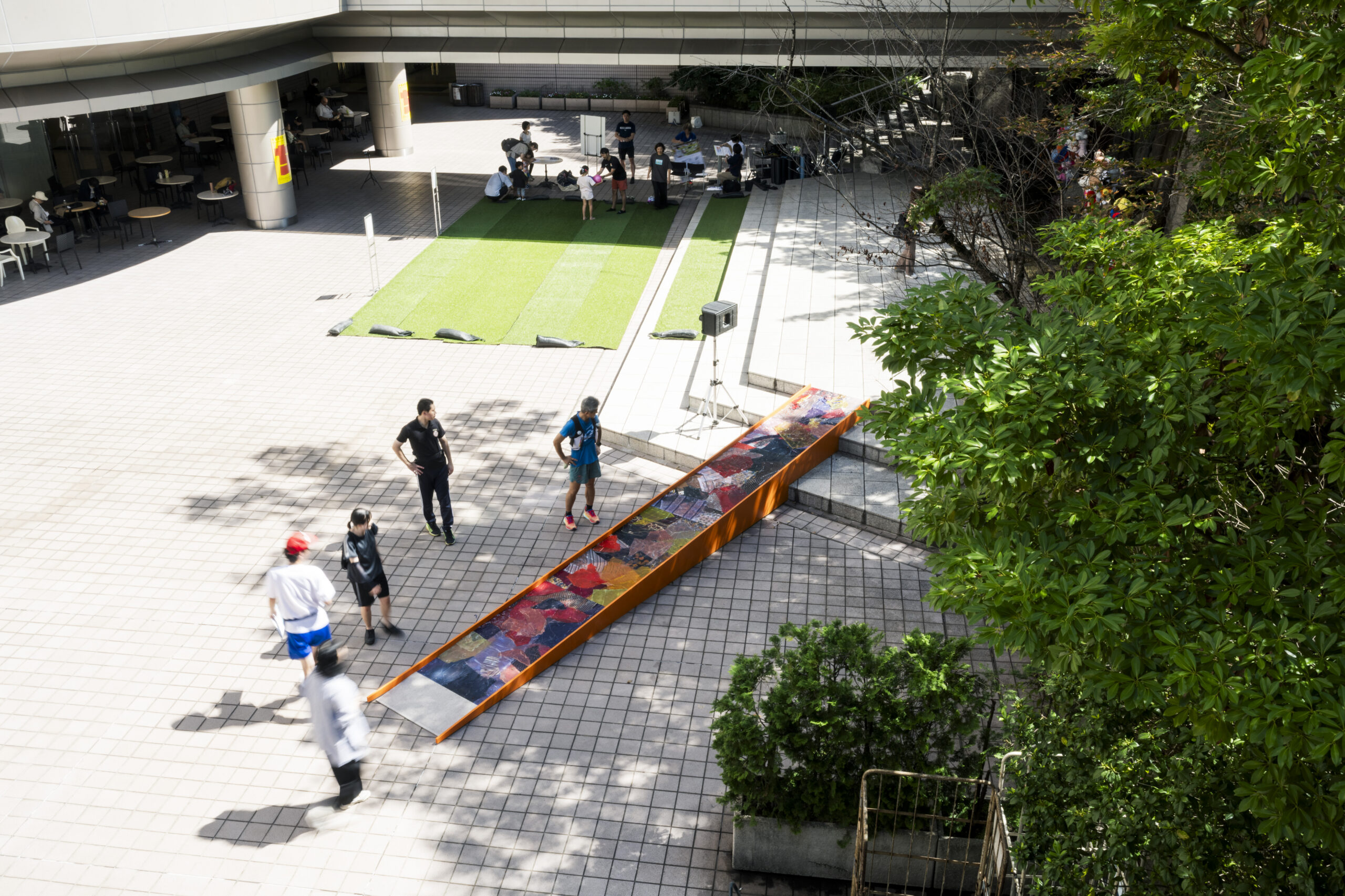 This project is a demonstration experiment to consider a more inclusive society where anyone can live easily, through the process of installing a slope upcycled from old clothes and plastics.