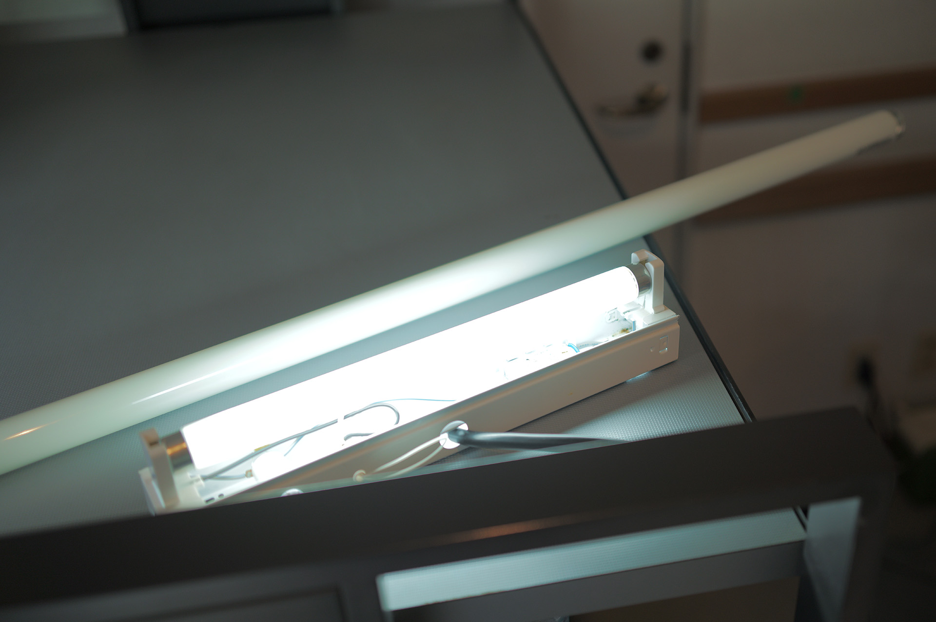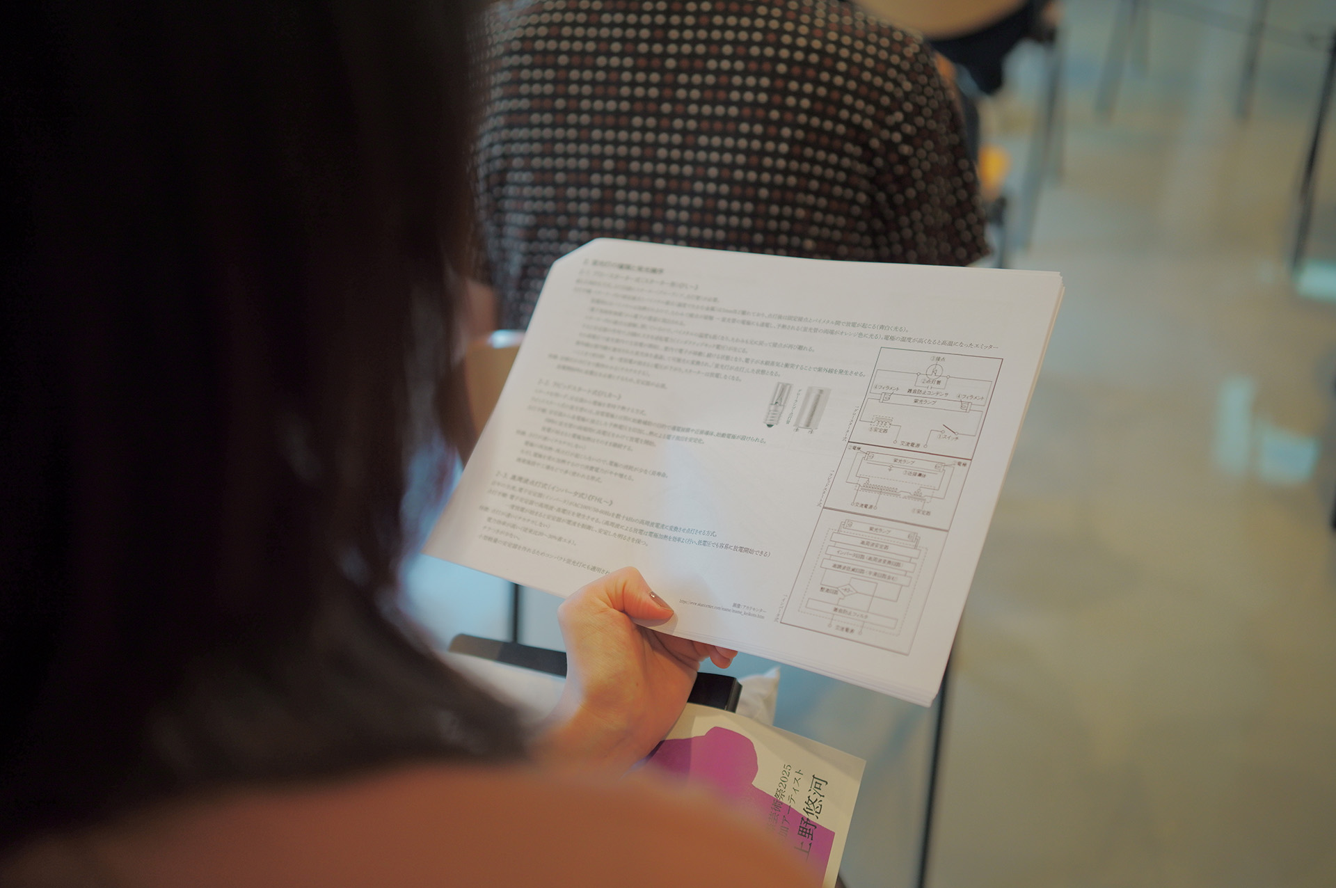 イベント前半では、上野氏による「蛍光灯」の講義が行われました。蛍光灯がどのような仕組みで光を生み出しているのか、その発展の歴史、そしてなぜ禁止されるのか。大学の講義さながらに資料を用いながら、「まず蛍光灯を理解する」という入り口から探求が始まりました。