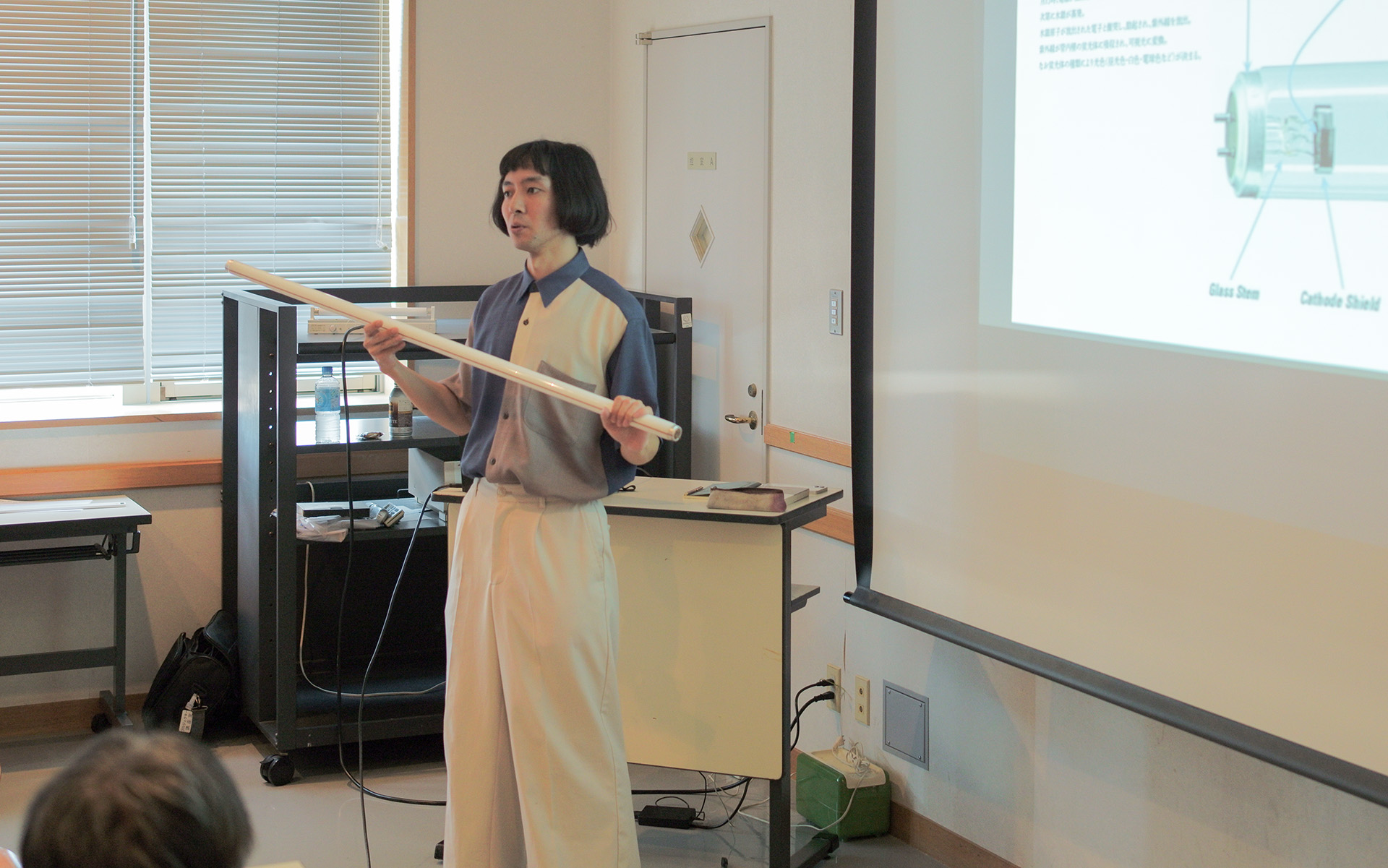 イベント前半では、上野氏による「蛍光灯」の講義が行われました。蛍光灯がどのような仕組みで光を生み出しているのか、その発展の歴史、そしてなぜ禁止されるのか。大学の講義さながらに資料を用いながら、「まず蛍光灯を理解する」という入り口から探求が始まりました。