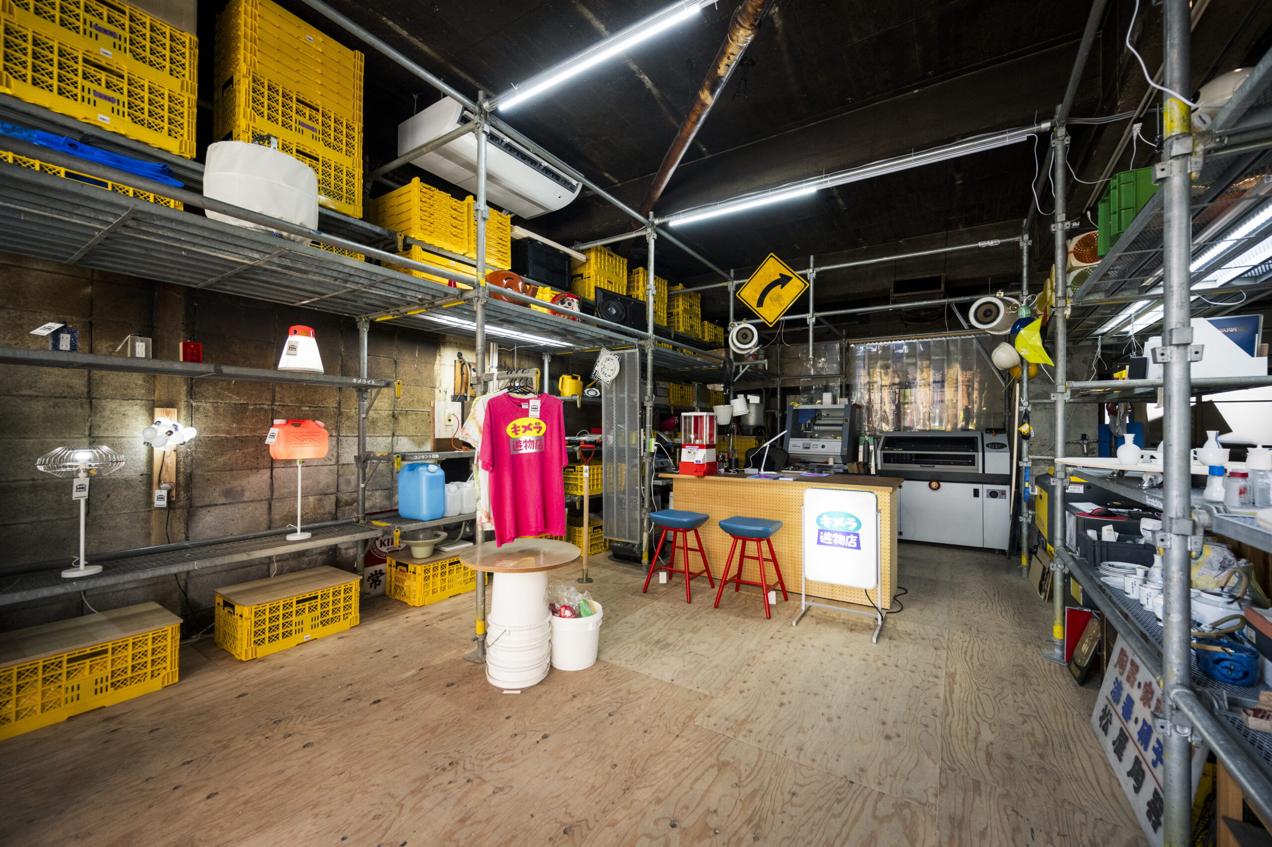 元厨房の1階は、岩沢兄弟がユニークなものづくりを展開する「キメラ遊物店」として運営。まちから集めた材料置き場・工房・店舗を兼ね、さまざまなモノとモノ、アイデアを組み合わせた「キメラ遊物」が岩沢兄弟とその仲間達によって日々生み出されていく。来場者はものづくりの様子を覗きつつ、ときどき開催されるワークショップに参加したり、材料やキメラ遊物を手にとれる。キメラ遊物店の中に謎店舗「“なんでも公式グッズ”セルフ」が立ち上がり、「芸術祭オフィシャル非公式グッズ」や「ちば公式土産(案)」を制作する予定。