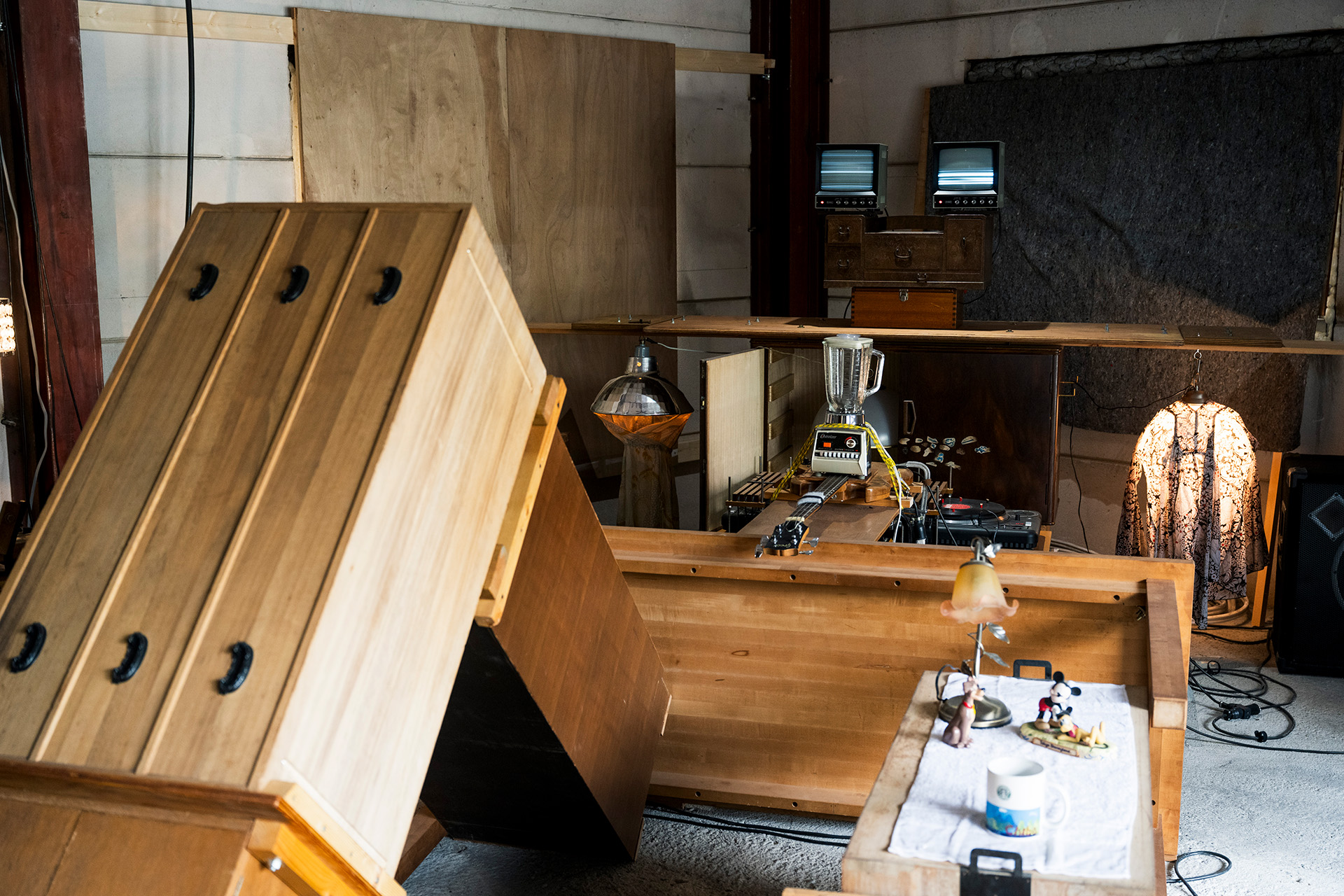 そして今回ついに、ある程度一般的な楽器として使うための整備を行った上で展示が完成しました。展示会場の2階に設置された《リファービッシュド・タンスロボ》に使用している家電製品がセットされたエレキギターとベースは、ミュート機構を解除すれば通常の演奏もできる状態です。