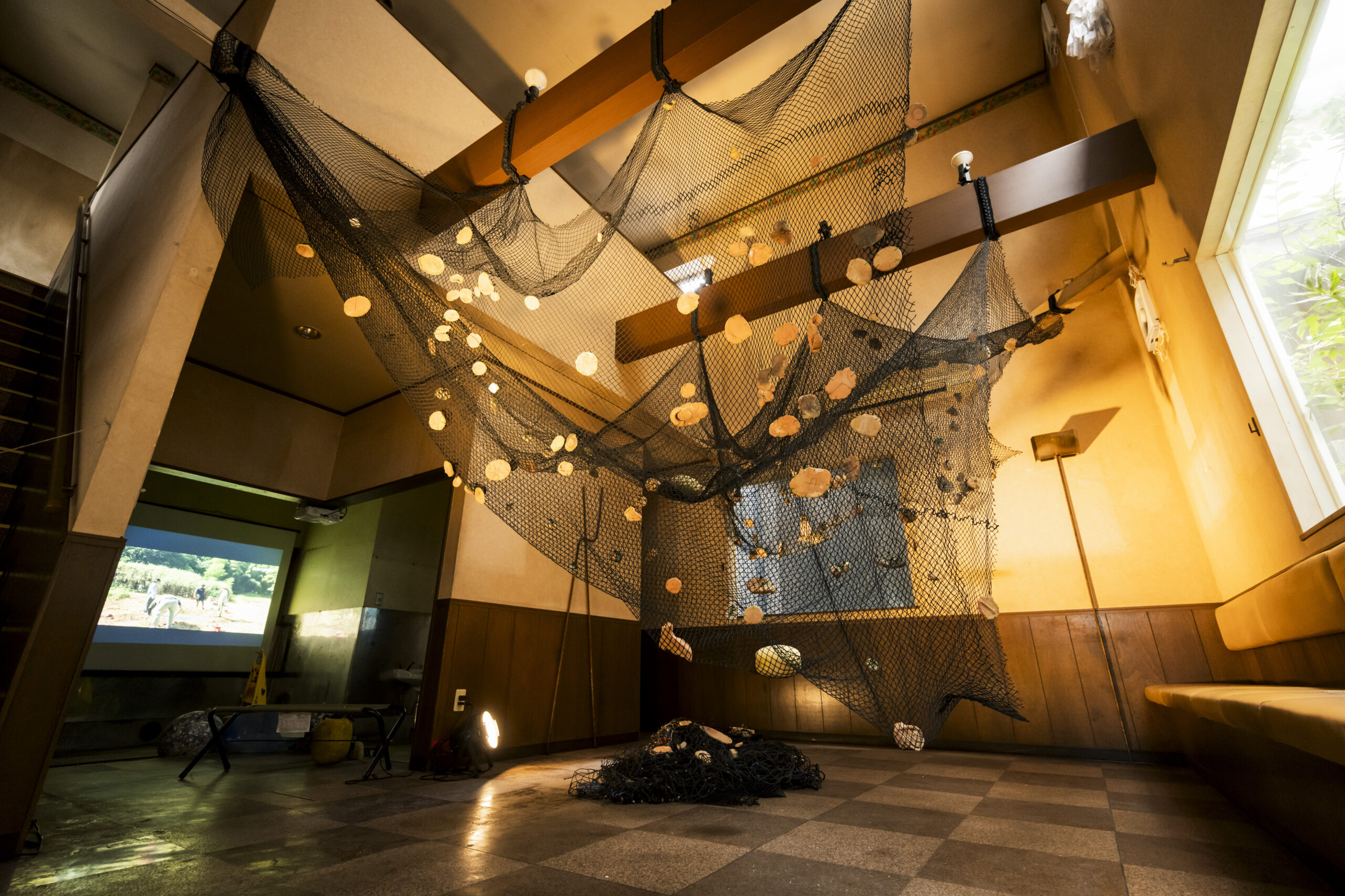 展示では大きな地引網の上に土や石の質感や重みを纏いながら作品が横たわり、その起伏や温度を通じて、一人一人の都市を見つめる視点、都市と自然の境界に触れる体験ができます。過去と現在、そして未来へと連なる時間の層を浮かび上がらせる本作は、変わり続ける都市の中で私たちが立っている「今」を照らします。千葉という土地に積み重なった記憶と変容を、どうぞ五感いっぱいに感じてください。
