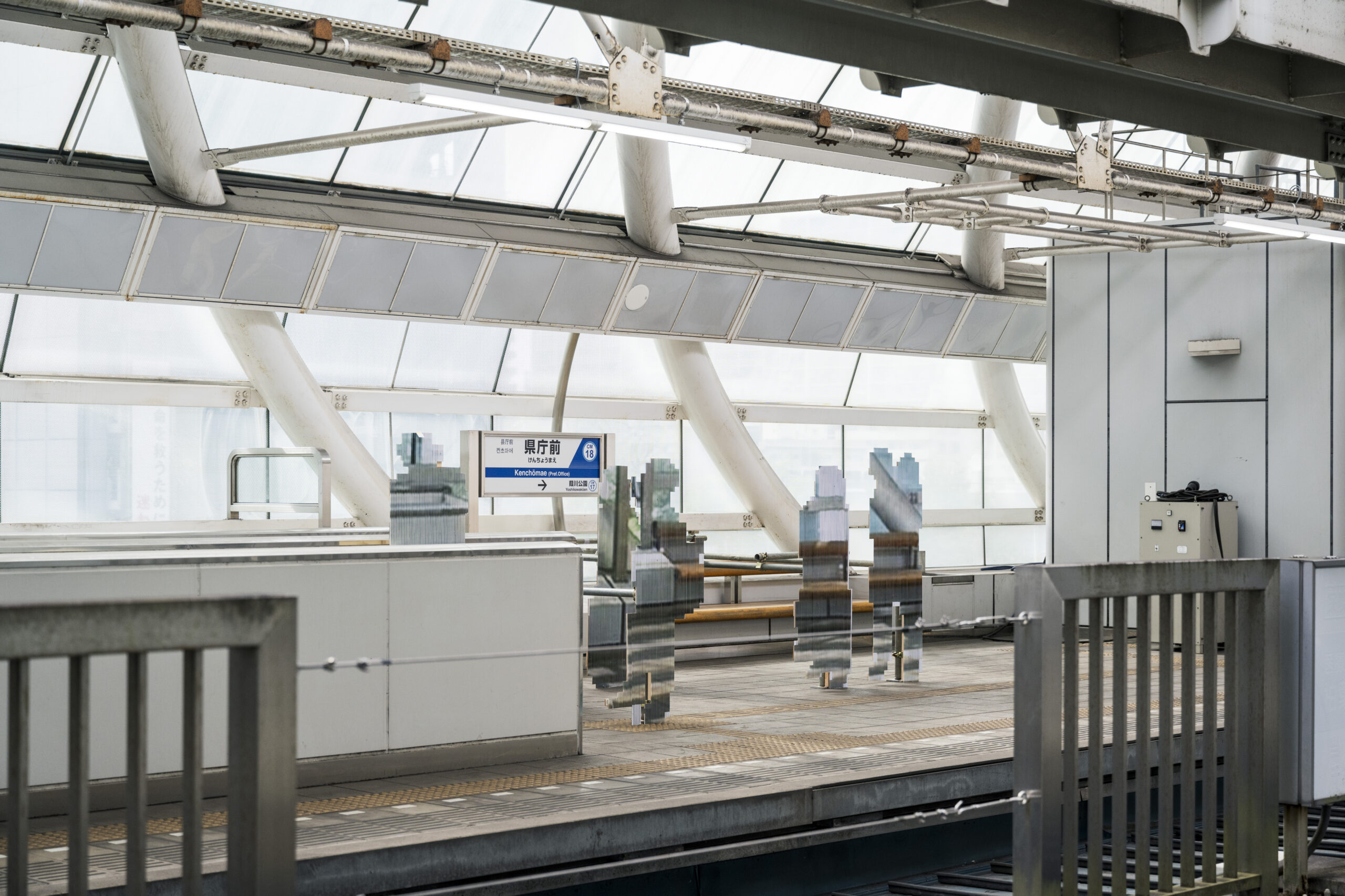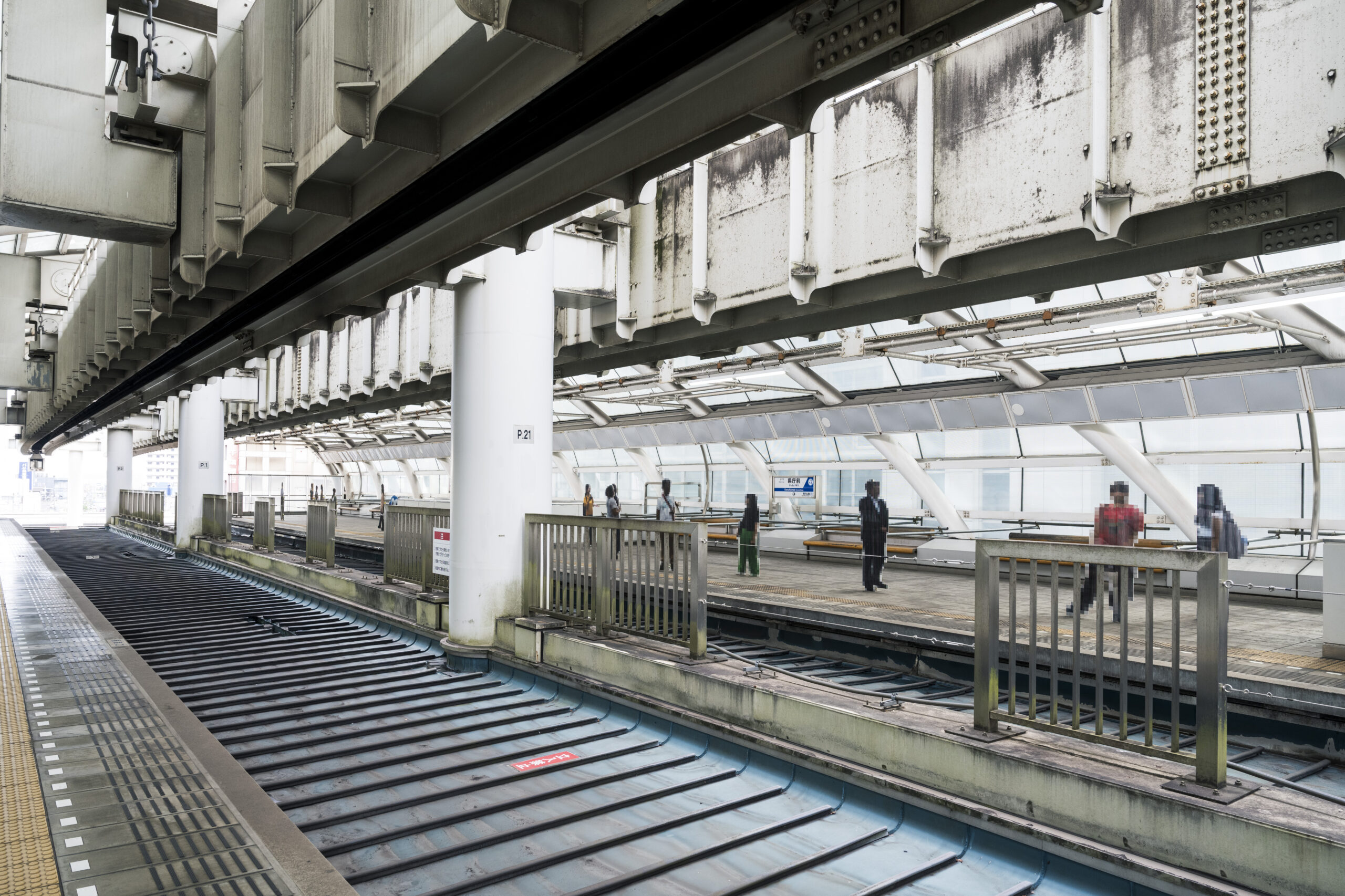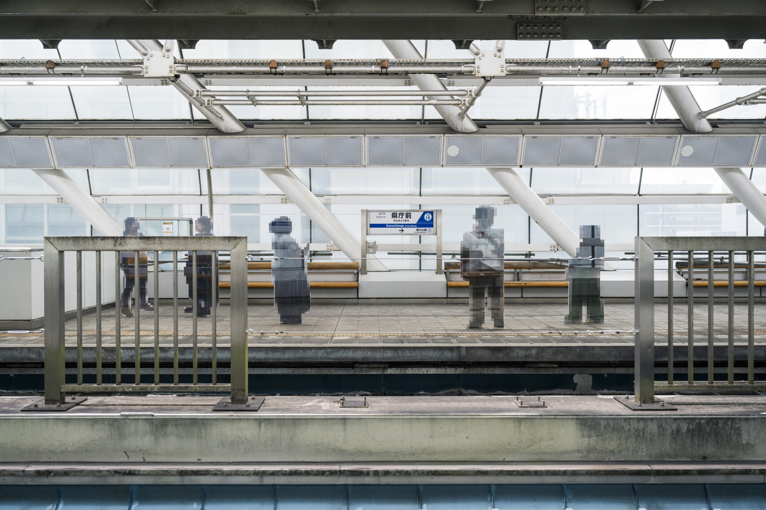 パネルの人物にはモザイク加工を施し、まるでデジタル空間から切り出され配置されたかのような印象を与える。鑑賞者が位置や視点を変えると、特殊な印刷や加工がなされた作品は透過され、パネルの人物はたちまちその姿を消し、空虚なホームだけが現れる仕組みとなっている。