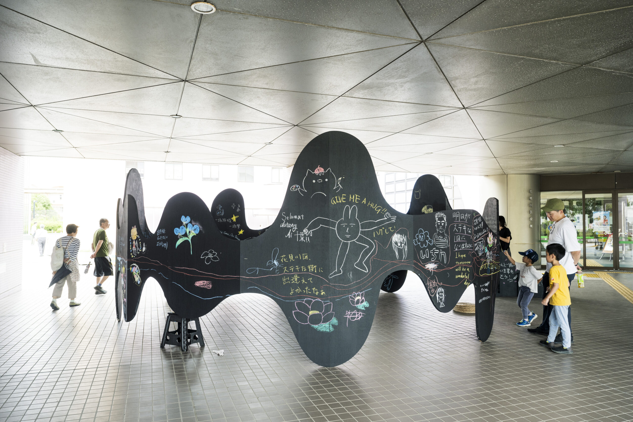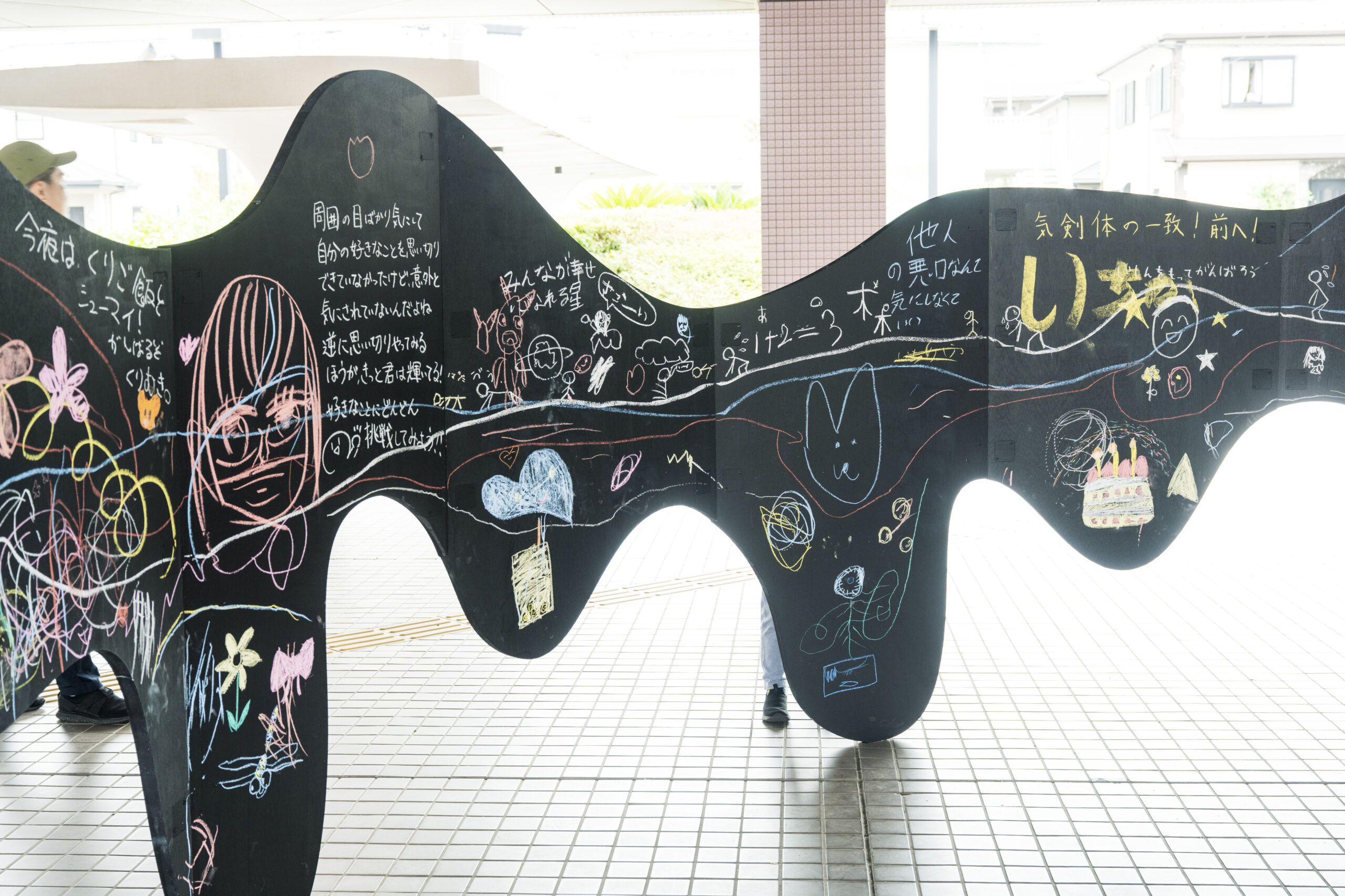 直径5メートルの環状黒板は、手を取り合い肩を並べて立つ姿から着想を得た曲線的な形状をしており、サポートと団結の象徴でもある。展示期間中、市民はカラフルなチョークを使って黒板にメッセージや絵を描き、互いにあたたかい励ましの言葉を交わすことができる。